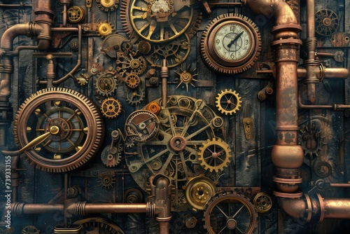 A steampunk style with gears pipes and clocks.