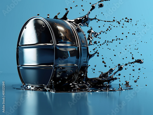 A steel barrel of black oil is tilted and water splashes out from the bottom