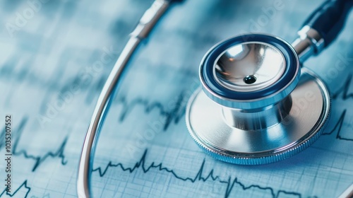 A stethoscope lying on an ECG medical chart, symbolizing healthcare, diagnosis, and heartbeat monitoring, with a focus on precision in medical care.