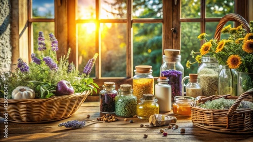 herb, flower, wooden table, window, sunlight, still life, nature, botanical, rustic, vintage, farmhouse, home decor, natural, organic, floral, arrangement, light, shadow, texture, cosy, warm, summer, spring, beauty