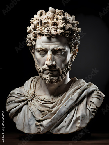 A stoic bust of Marcus Aurelius, sculpted from weathered marble with cracks and veins that hint at the passage of time, bathed in dramatic chiaroscuro lighting that accentuates