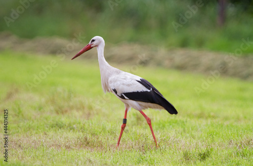 A Stork with a ring on its leg walks through a freshly mown meadow