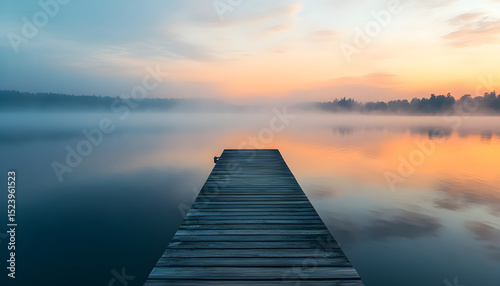 A straight flat simplistic rectangular lake dock, beautiful sunrise, foggy, calm water