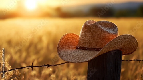 A straw cowboy hat resting on a fence post at sunset in a field.