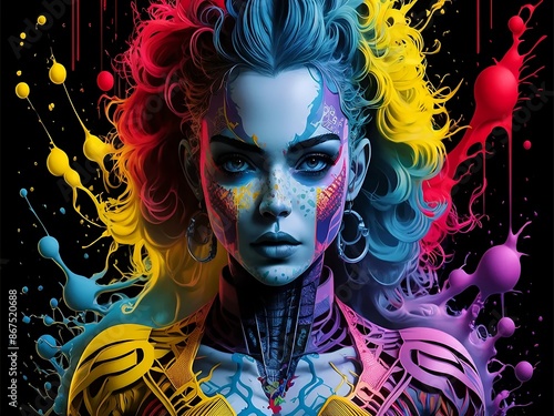 A striking monochromatic portrait by TMann NYC that captures the essence of a Cyberpunk Digital Artist girl in a vibrant comic-style linocut illustration. Generative ai