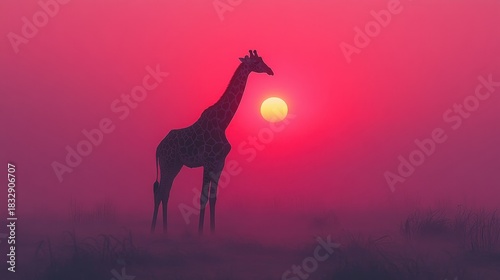 A striking silhouette of a giraffe is set against a vibrant pink and orange sunset sky, creating a peaceful and majestic image.