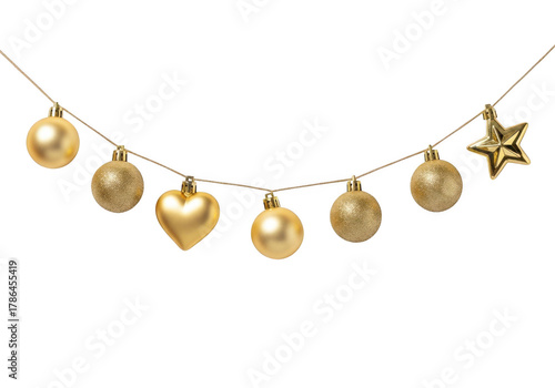 A string of golden christmas ornaments including balls, a heart, and a star, isolated on transparent background