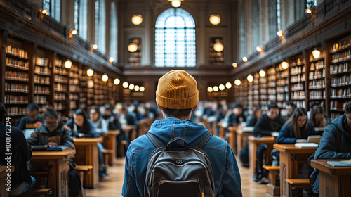 library, student, studying, book, shelf, learning, education, quiet, sharpened, yellow, beanie, backpack, table, research, academic, interior, reading, writing, concentration, teamwork, information, cognition, university, college, scholarly, historic, modern, atmosphere, people, literature, workspace, environment, resource, depth, timeless, culture, inspiration, calmness, creativity, exploration, room, architecture, gathering, community, silence, thought, student, row, discovery