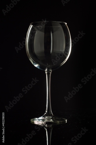 A studio shot of an elegant, isolated wine glass on black with reflections