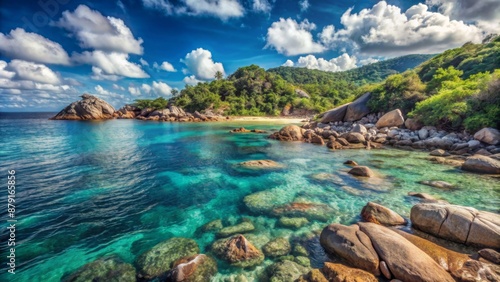 A stunning coastal landscape featuring a rocky shoreline and crystal-clear turquoise waters
