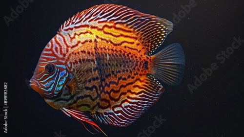 A stunning discus fish displaying its intricate patterns in an aquarium.