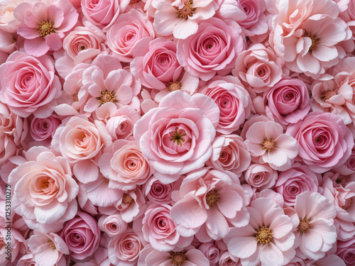 A stunning floral background featuring delicate pink roses and peonies in soft pastel hues. Perfect for romantic designs, wedding invitations, and elegant decorative projects.