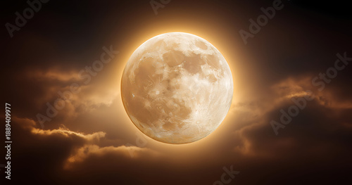 A stunning full moon lit by golden light, casting a mystical glow through dark clouds in a serene night sky.