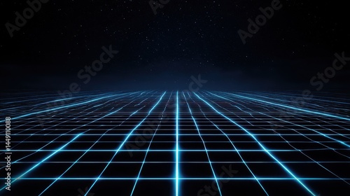 A stunning image of futuristic neon abstract background with glowing blue grid and dark space.