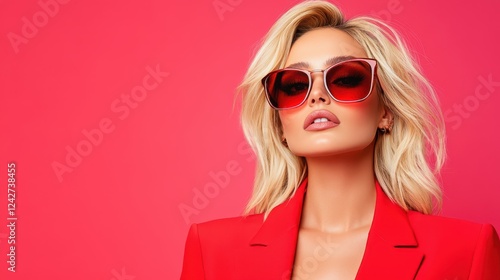 model, sunglasses, red, blazer, pink, background, professional, studio, fashion, portrait, confidence, beauty, colours, styling, female, lighting, trendy, accessory, glamour, chic, posing, expression, head shot, editorial, modern, make-up, hair, bold, striking, contemporary, designer, elegance, fashionable, shoot, feature, visual, art