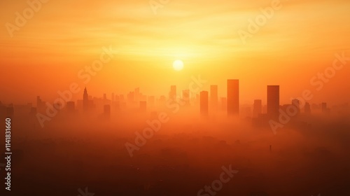 A stunning skyline at sunset, with silhouettes of buildings shrouded in orange and yellow hues, creating a serene, atmospheric scene.