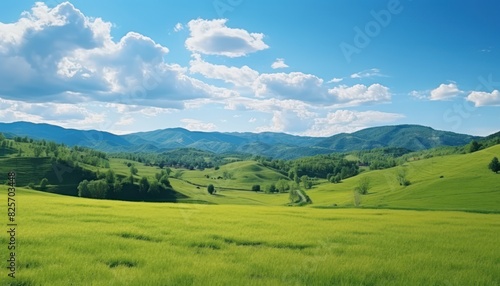 A stunning spring day landscaping views of fertile land surrounded beautiful green vegetation, wide stretches of hills and mountains with clear skies in spring