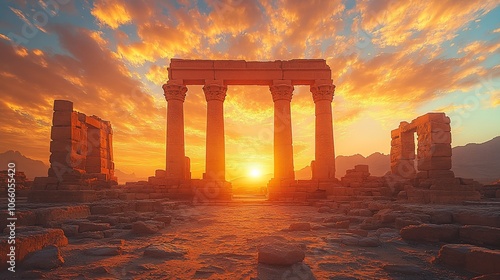 sunset, temple, ruin, pillar, ancient, history, architecture, sky, cloud, desert, mountain, travel, vacation, culture, heritage, landmark, exploration, photo, landscape, gold, light, silhouette, dramatic, majestic, beauty, wonder, mystery, time, past, present, future, peace, serenity, hope, inspiration, faith