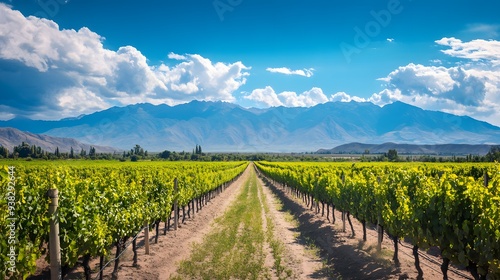 A stunning view of a lush vineyard stretching towards majestic mountains under a bright blue sky with scattered clouds, showcasing the beauty of nature and agriculture.