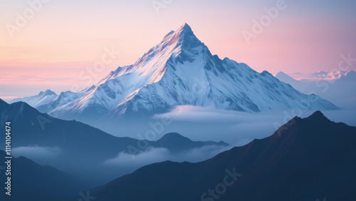 A stunning view of a snow-capped mountain peak at dawn, surrounded by soft clouds and a serene landscape, capturing the beauty of nature and tranquility.