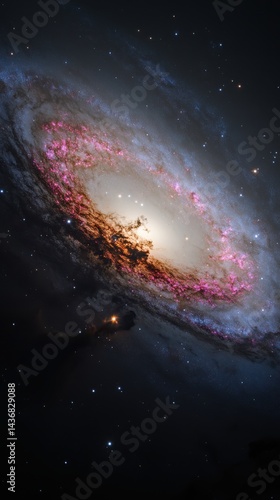 A stunning view of a spiral galaxy with vibrant pink and orange hues, showcasing cosmic beauty.
