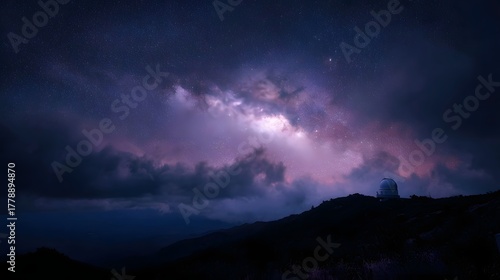 observatory, lactic, way, galaxy, night, star, astronomy, nebula, cosmos, universe, sky, stellar, celestial, space, light, glowing, aglow, bright, dark, purple, pink, blue, cloud, atmosphere, atmospheric, mountain, hill, landscape, nature, remote, isolated, dome, structure, science, research, technology, discovery, wonder, mystery, serene, tranquil, huge, panoramic, epic, dramatic, aethereal, mystical, twilight
