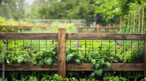 A sturdy wooden fence encloses lush green garden beds, showcasing healthy plants flourishing in a tranquil outdoor setting. Generative AI