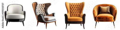 A stylish collection of four elegant chairs featuring modern designs and rich textures, perfect for any interior decor. on transparent cutout, PNG file
