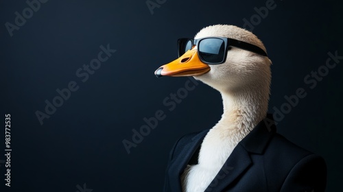 A stylish duck wearing sunglasses and a suit, striking a confident pose against a dark background. Humorous and creative concept.