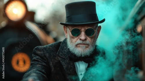 A stylish man wearing a hat and tinted glasses stands near a vintage train, blending elements of nostalgia with contemporary fashion, symbolizing timeless elegance and adventure.