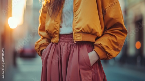 A stylish young woman of Caucasian descent wearing a vintage orange bomber jacket paired with a flowing pink skirt, exuding casual elegance.