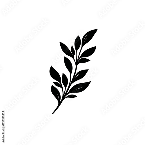 A stylized black and white illustration of a botanical sprig with multiple leaves on white background
