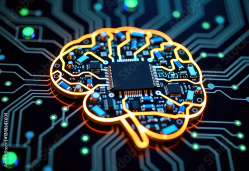A stylized brain circuit overlaid on a circuit board, visually representing the concept of artificial intelligence or brain-computer interface.