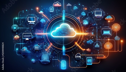A stylized graphic of a cloud computing concept with connected devices, icons, and glowing lines, symbolizing data transfer and digital connectivity.