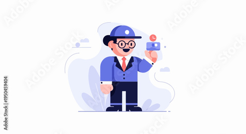 A stylized person in a suit and cap holds a small object with a clock icon