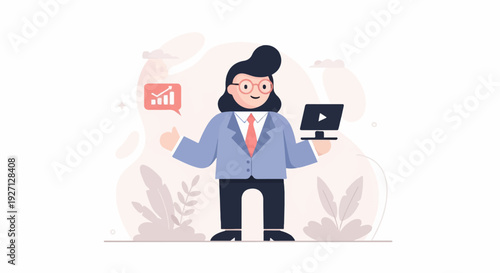 person, stylised, suit, jacket, attaching, goggles, hair, laptop, screen, play, buttons, thumb, up, gesture, speech, bubble, graph, chart, growth, success, business, office, work, professional, career, technology, digital, media, video, content, marketing, strategy, analysis, datum, performance, achievement, progress, development, innovation, idea, concept, representation, icon, graphic, illustration, modern, clean, simple, flat
