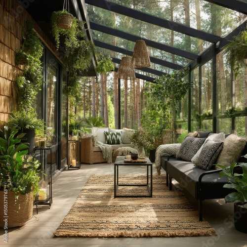 A sun-drenched conservatory filled with lush greenery and comfortable seating.