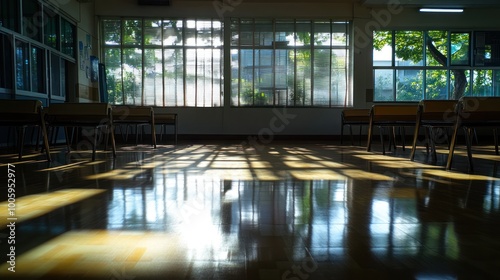 A sunlit classroom with empty chairs and reflections on the polished floor.