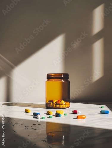 A sunlit composition featuring a bottle of vitamins and scattered supplements on a textured surface.