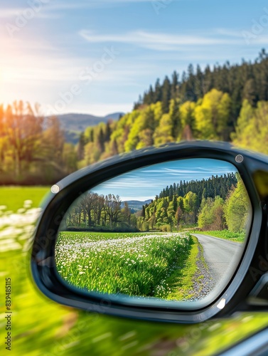 A Sunny Day Road Trip Through A Green Valley Reflected In A Rearview Mirror