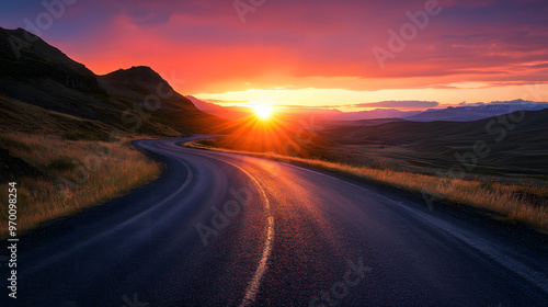 A sunset over a mountain road with the sun setting behind the peaks and the road winding through the landscape creating a sense of adventure and freedom.