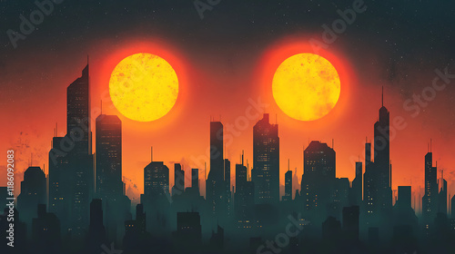 A surreal cityscape featuring two suns setting behind skyscrapers in a vibrant sky.