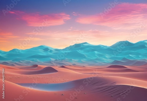 A surreal desert landscape at sunset, featuring a vibrant sky with pink and orange hues, and a surrealistic representation of mountains and dunes.