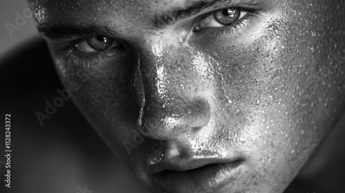 perspiring, droplet, face, close, up, portrait, young, man, male, skin, texture, monochrome, black, white, intense, gaze, eye, eyebrow, nose, mouth, lip, detail, expression, emotion, serious, focused, powerful, strong, photogenic, beauty, model, photo, head shot, image, human, person, glistening, moisture, damp, wet, reflective