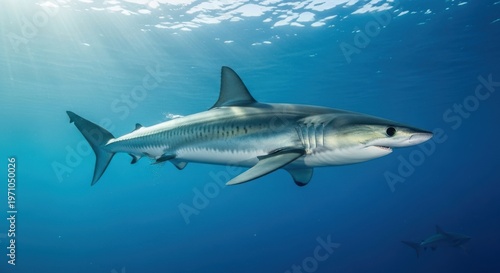 A swift Mako shark glides through the deep blue ocean waters with sunlight dappling its powerful form