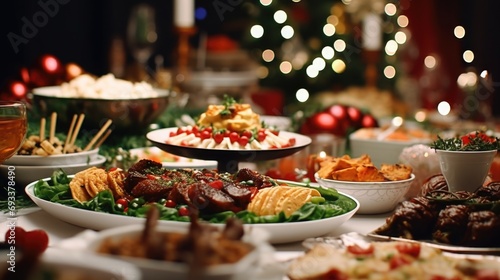 A table filled with plates of food and a Christmas tree in the background. Perfect for holiday celebrations and festive gatherings