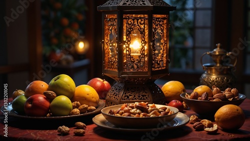 A table set with various fruits and nuts, with a lantern emitting warm light. The scene is accented with traditional decorations, suggesting a festive or celebratory atmosphere.