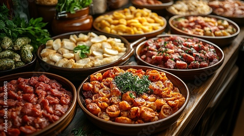 food, table, bowl, wooden, rustic, brown, dish, widener, assortment, variety, meal, cookery, dining, delicious, savoury, tasty, favor, ingredient, herb, spice, garnished, fresh, green, parsley, onion, diced, chunk, meat, pork meat, chicken, sausage, potato, pasta, cheese, platter, feast, celebration, gathering, banquet, dinner, lunch, dinner