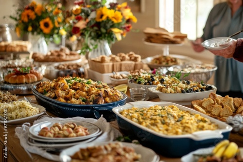 table, food, dish, widener, sunflower, fall, flower, bouquet, casserole, dish, serving, platter, blue, white, brown, wooden, kitchen, dinner, meal, feast, holiday, party, gathering, celebration, festive, rustic, cosy, warm, inviting, delicious, savoury, sweet, dessert, side, baked, cooked, ingredient, herb, spice, bread, crouton, cheese, sauce, gravy, crumb, topping