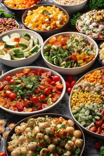 A table with multiple bowls of different types of food, ideal for use in editorial or commercial contexts